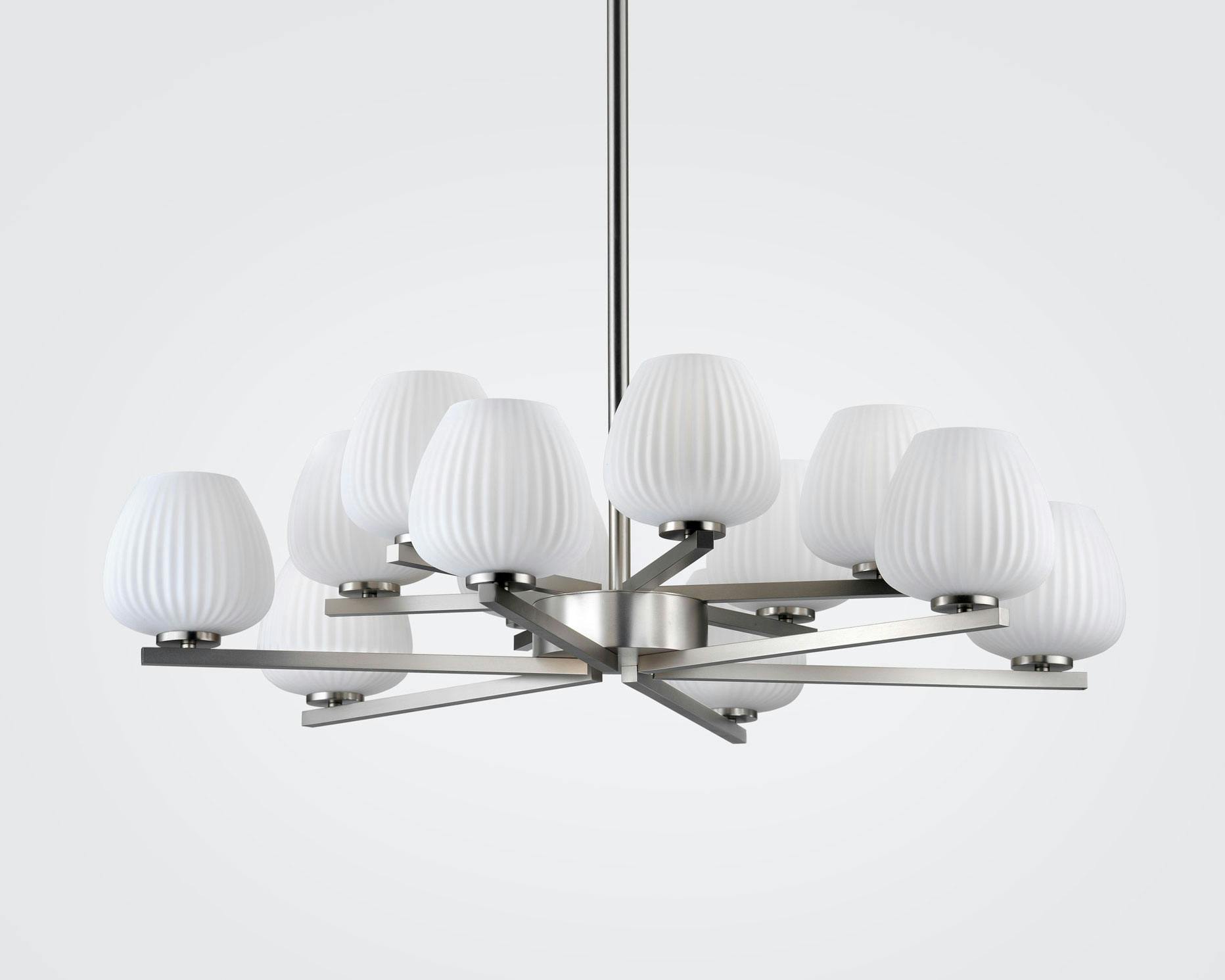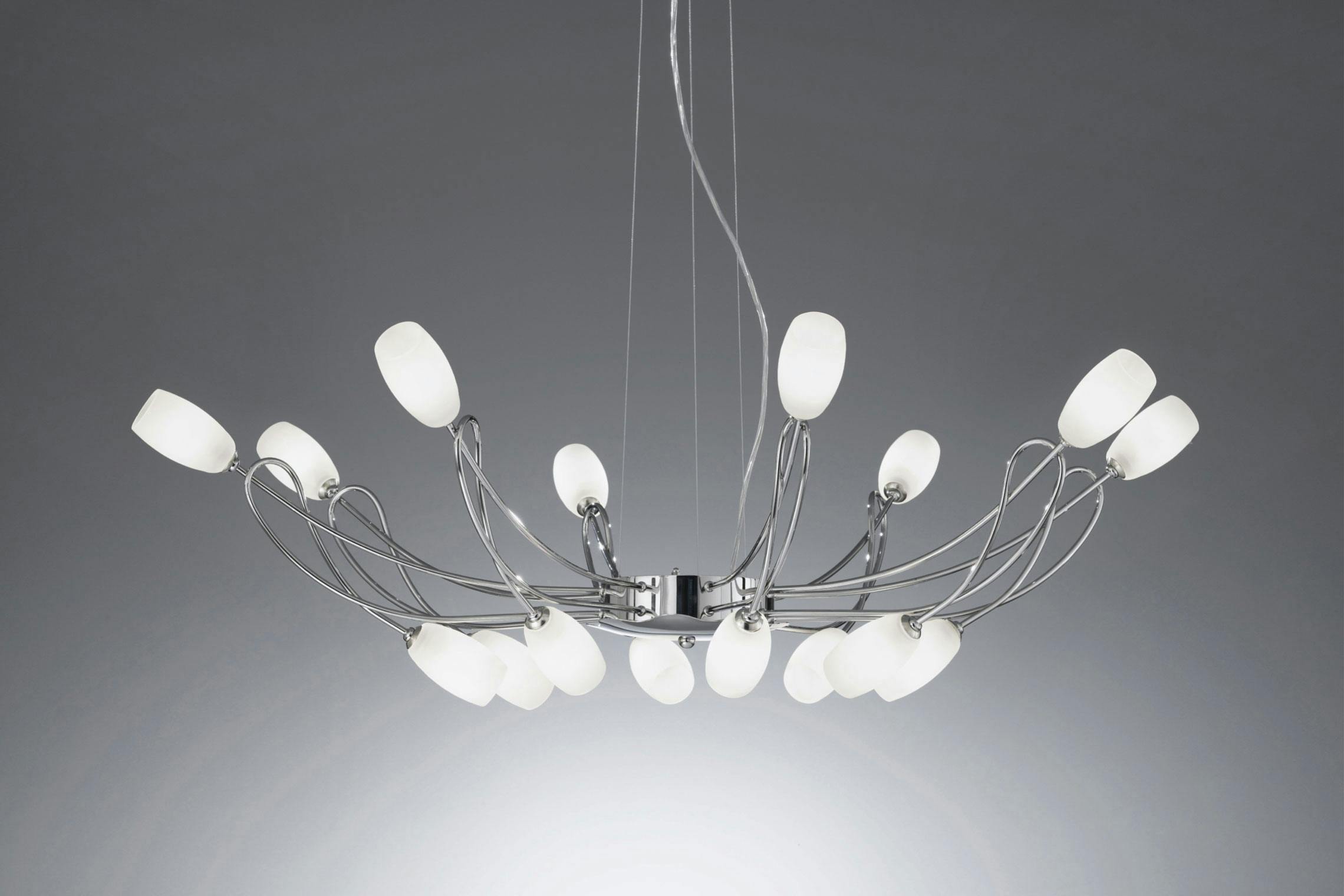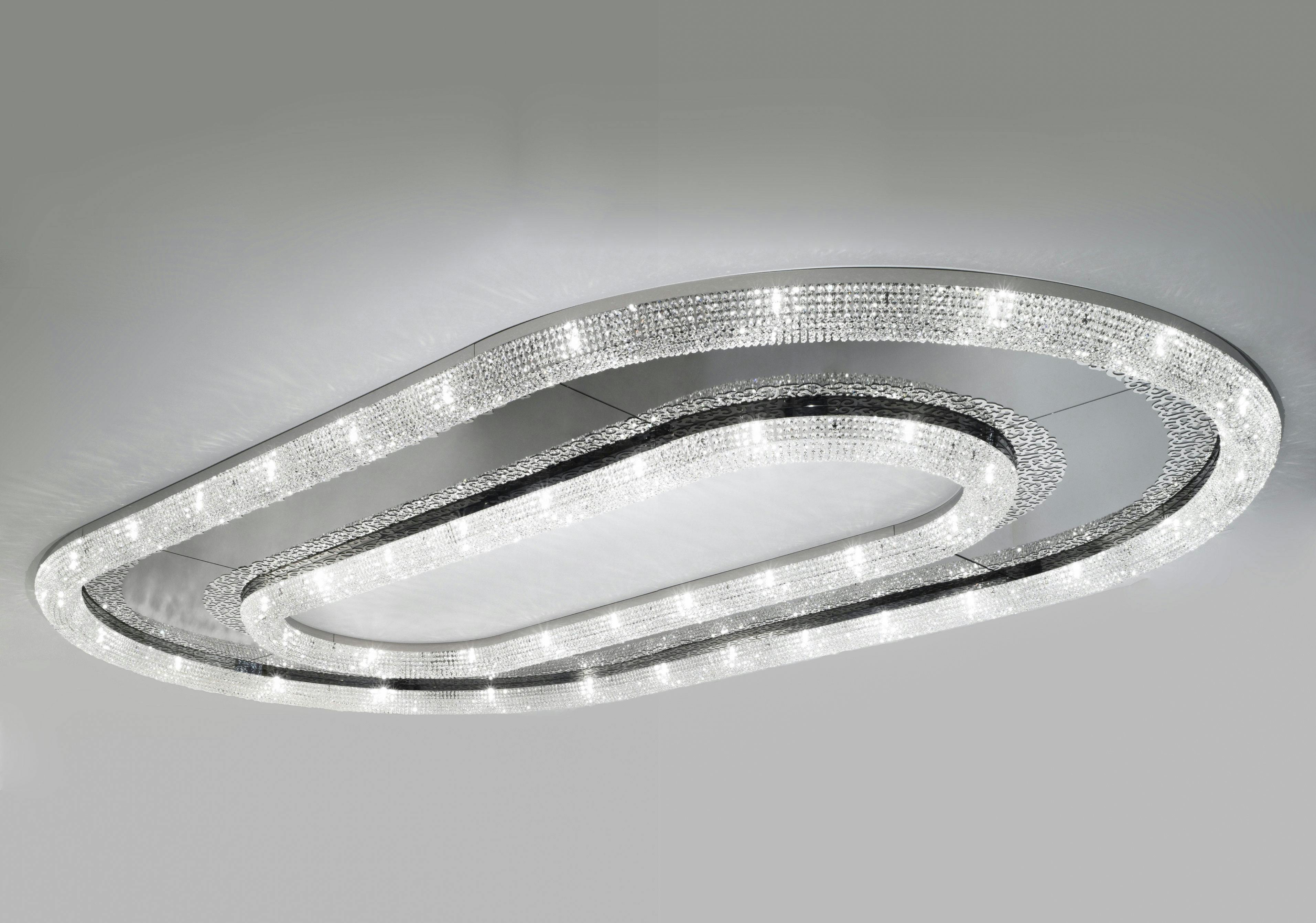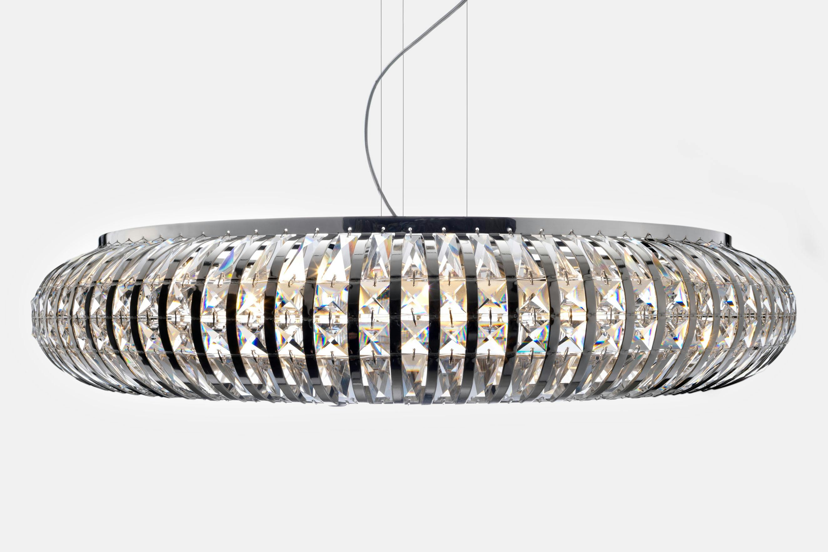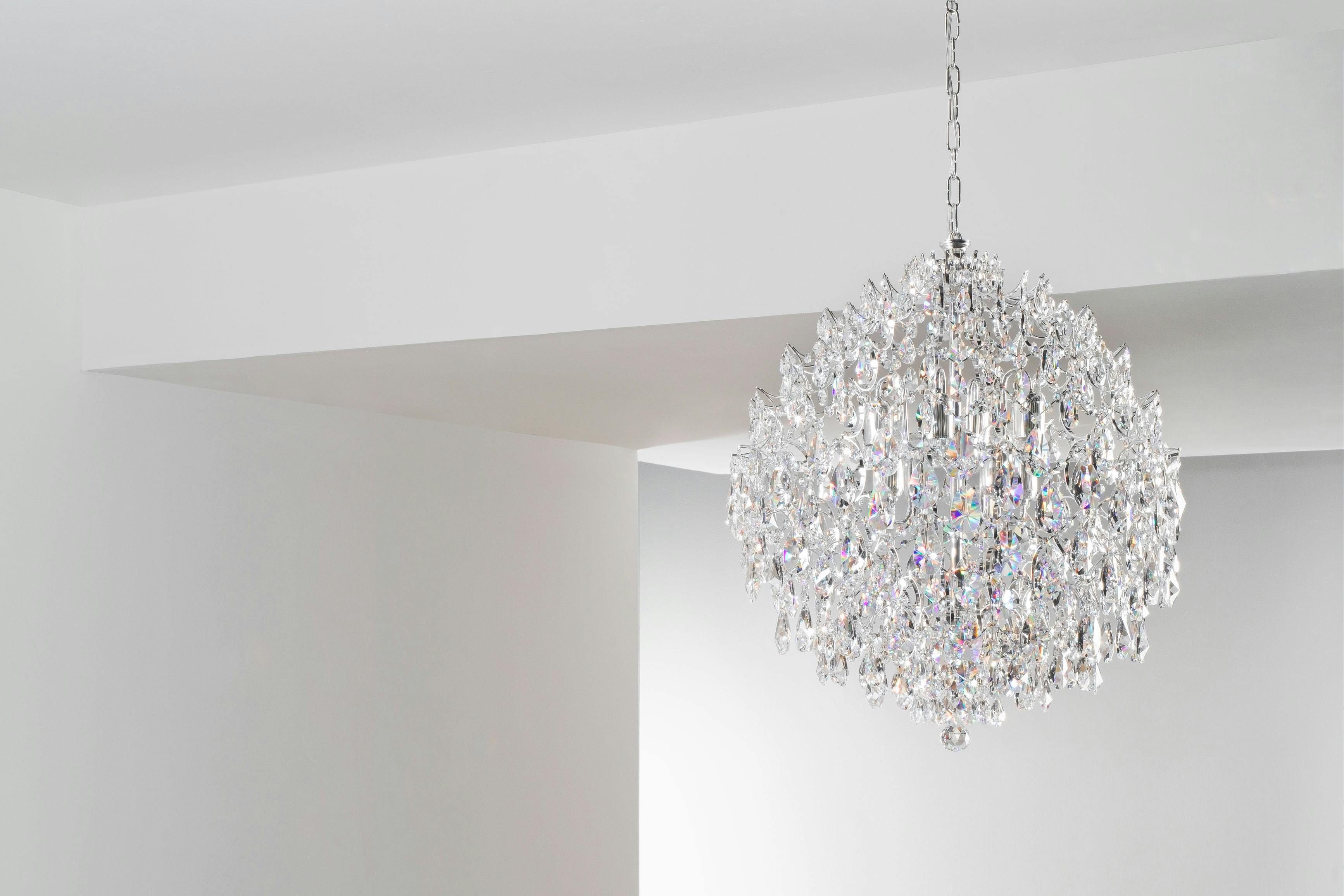 Idra in its table version 94100/LMC25 with a Chrome finish, Clear SH crystals and White cotonette lampshades