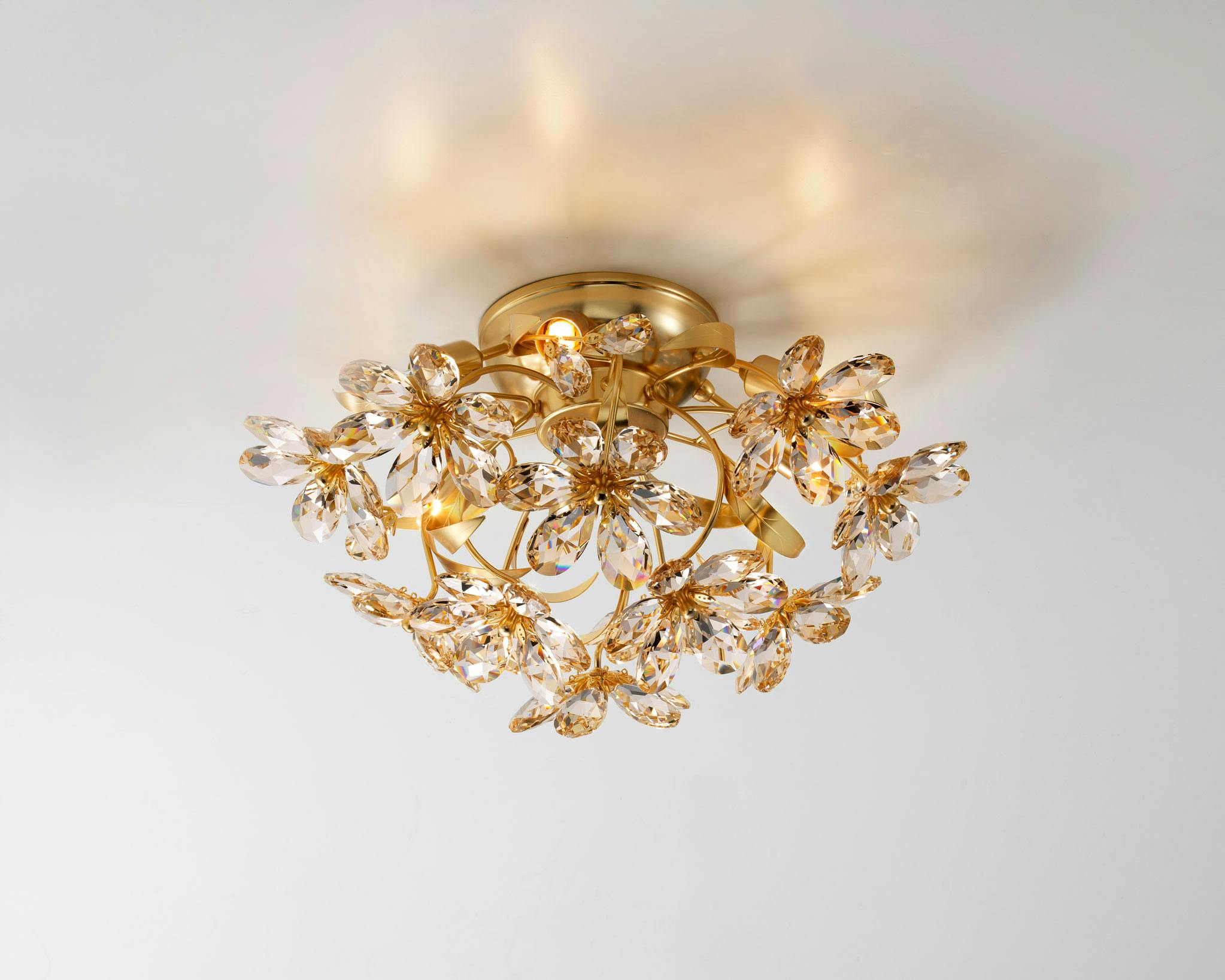 A tribute to the elegance of nature, this collection evokes the delicate movement of flowering branches. Curved brass arms unfold like blooming stems, while each crystal petal captures and reflects the light with botanical grace. Inspired by the sinuous lines of Art Nouveau, the design blossoms into luminous compositions with refined, natural charm.