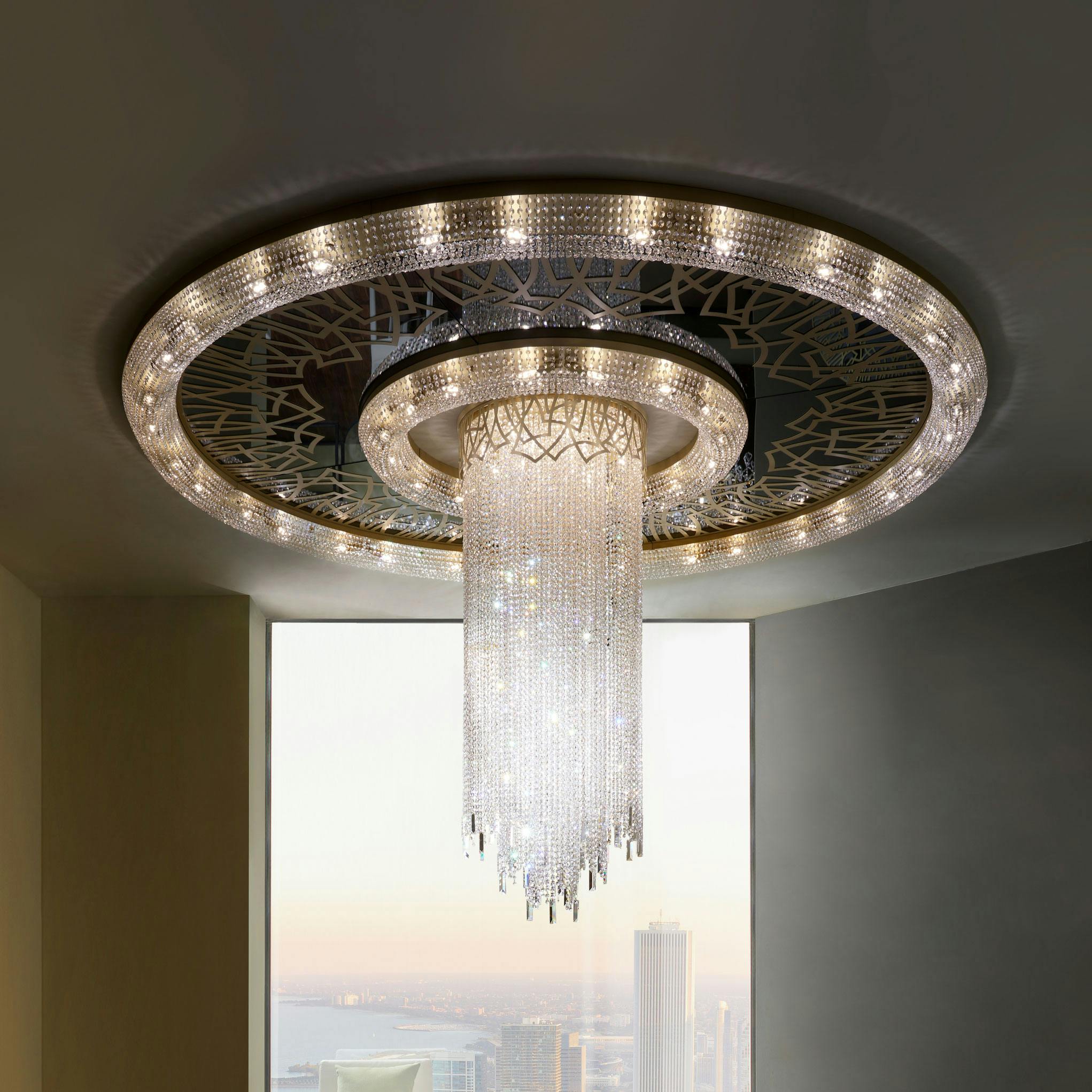A system designed to multiply, adapt, and transform. Saturno offers complete compositional freedom: every element – from perforated decorations to metal finishes, mirrors, crystals, and lampshades – can be selected and combined to create always-unique configurations. A modular collection that opens up to endless expressive possibilities, capable of reflecting the style and vision of any project.