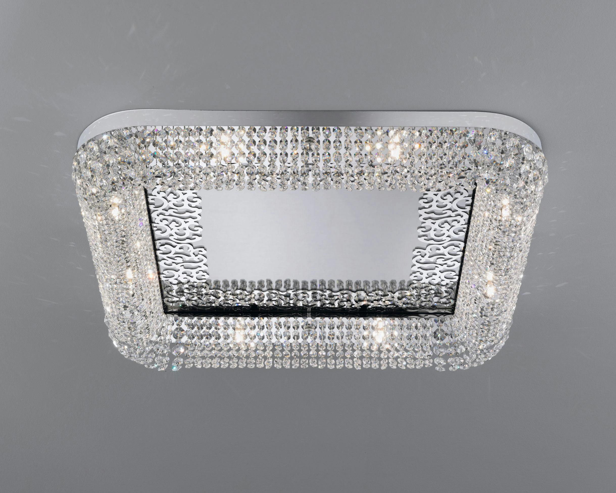 The SAH/P80X80 ceiling version with Chrome finish, Smoked mirror, Barò decorations and Clear AS crystals.